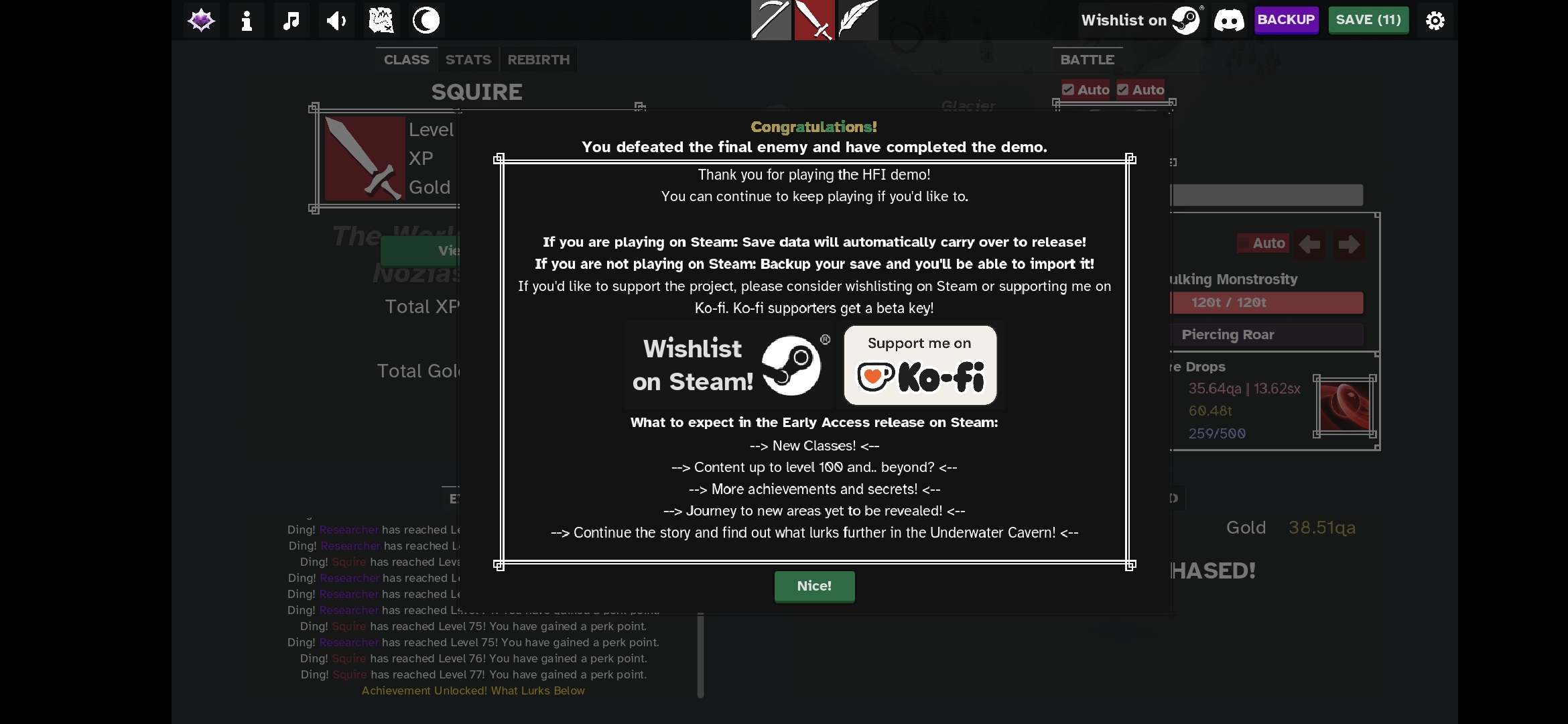 hours in, this game has major possibilities. very well done game-play loop for a demo making me want to keep playing even though i normally dislike putting so much time in just demos. as a dev myself, i am curios of what game engine is used if any, what coding language its codded in, and wether or not a linux version is planned. although some game engines allow for you to easily export a project into mac windows and linux versions, some don't do it as well as others. i am already ready to drop 10-20 bucks on this, good work. i would cretiqe this, but it is only an itch demo so its hard to tell what is planned. one thing i can cretiqe rn is automation. the option to auto use attacks in the "fighting part" doesn't save weither or not you previosly had it selected. also i have hope that there will be a way to import demo saves to the full game. one final cretiqe is currently it is hard to tell where the game "ends". weither this is just cause of it being a demo or cause there isnt enough "push" to get you to keep going i am unshure, but for the full game i recomend teaching at the start that it may seem like the game is over but there is "hidden" things you can unlock by continuing, while keeping the stuff still "hidden" like how the unlocking researching felt, because that rewards players for being curios and also makes people more hooked on "finding out what comes next".